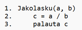 - Määritellään funktio Jakolasku, joka saa parametreiksi muuttujat a ja b. Tämä rivi kertoo vain, että funktiolle annetaan kaksi arvoa. Funktio ei vielä tee laskutoimituksia.