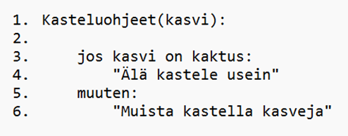 - Määritellään funktio Kasteluohjeet, joka ottaa parametriksi muuttujan kasvi.