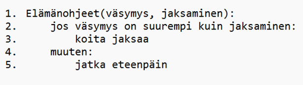 - Määritellään funktio elämänohjeet, joka saa parametreiksi muuttujat väsymys ja jaksaminen.