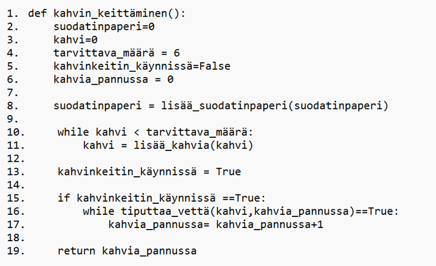 - Ajetaan while‑silmukkaa, jonka ehto on tiputtaa_vettä(kahvi, kahvia_pannussa) == True. Pseudokoodi ei näytä, miten tiputtaa_vettä‑funktio toimii, mutta voidaan päätellä, että funktio palauttaa joko True tai False tilanteen mukaan. Kun funktio lopulta palauttaa False (esimerkiksi silloin kun kahvia ei ole enää jäljellä tai pannussa on tarpeeksi kahvia), silmukka päättyy.