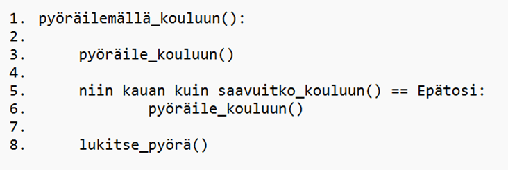 Voit lisätä alkuun, että kyseessä on funktio. ”niin kauan kuin” kuvastaa while‑silmukkaa. Tämä tarkoittaa, että tiettyä toimintoa toistetaan niin pitkään, kun ehto on voimassa (True).