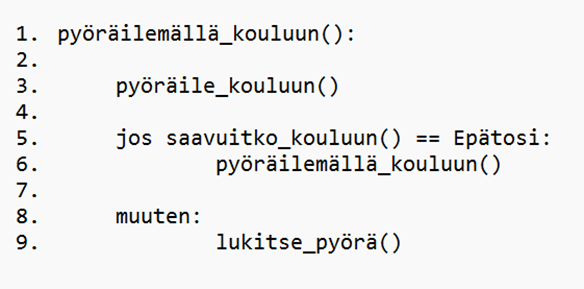 Käytetään rekursiota. Kutsumalla koko pyöräilemällä_kouluun()‑funktion varmistat, että jokaisen ajokerran jälkeen ehto tarkistetaan. Jos toistaisit vain pyöräile_kouluun()‑kutsua, suoritus etenisi yhden pyöräilyvaiheen jälkeen suoraan “muuten”‑haaraan ilman uutta ehtotarkistusta. Tämä veisi ohjelman väärään kohtaan vuokaaviossa. Rekursion avulla koko prosessi suoritetaan aina kokonaisuutena, kunnes kouluun on saavutettu.