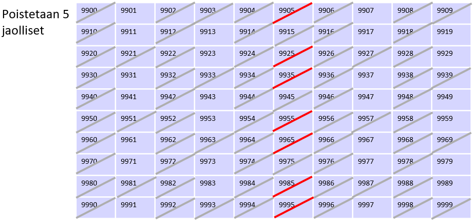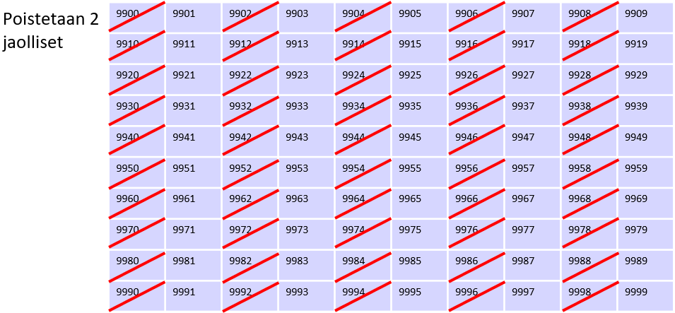 Tällä tekniikalla voidaan myös sulkea pois suoraan 2 ja 5 jaolliset luvut, koska ne havaitaan helposti:
