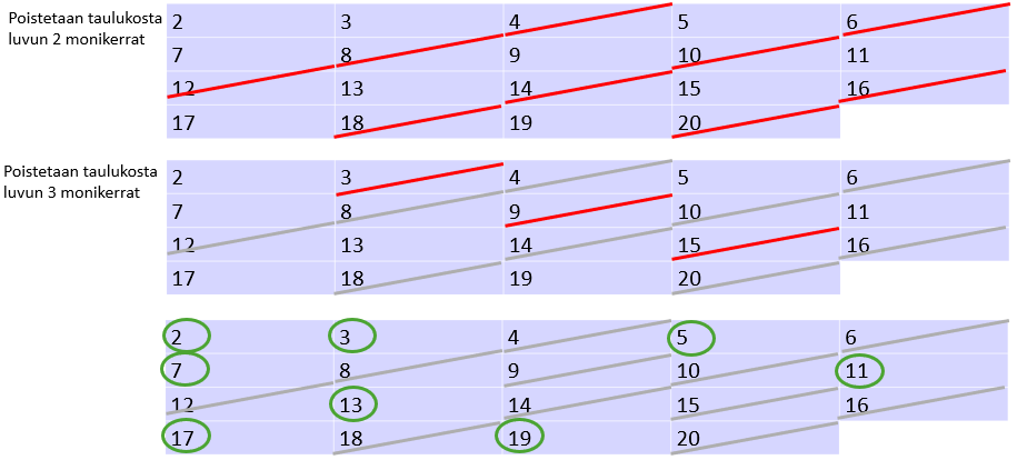 Tehtävä 3. Toteuta Eratostheneen seula ja selvitä sen avulla kaikki alkuluvut väliltä 2-20.