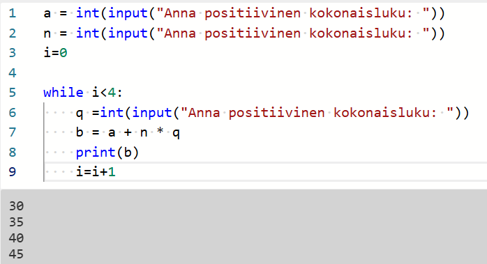Tehtävä 7. Ratkaise ohjelmallisesti. Pyydä input()-funktion avulla arvot.