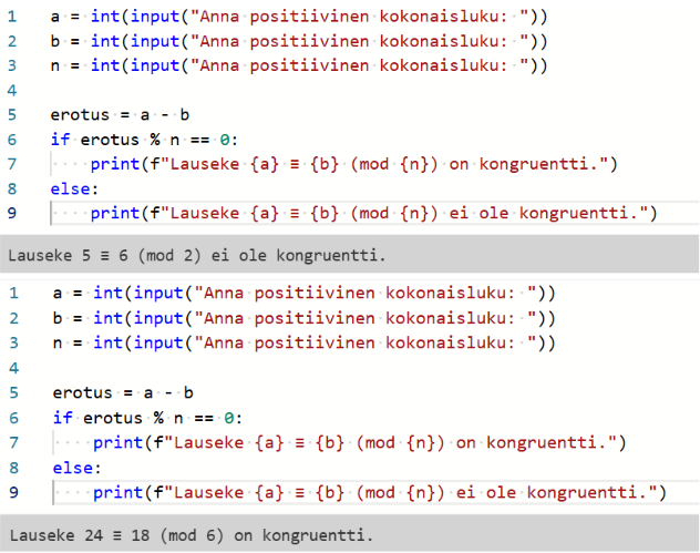 Kongruenssin arvot riippuvat input()-funktiolla annetuista arvoista.