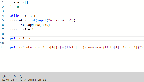 Tehtävä 6. Kirjoita ohjelma, joka pyytää käyttäjältä 4 lukua. Lisää ne annetussa järjestyksessä listaan. Tämän jälkeen laske listan ensimmäinen ja viimeinen luku yhteen indeksejä käyttäen.