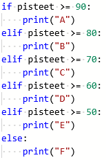 a) Eräs koe arvioidaan arvosanoilla A, B, C, D, E ja F, jossa F on hylätty. (Kyseessä lienee kaiketi ulkomaalainen koe.) Arvosanat annetaan lineaarisesti pisteiden mukaan. Jos oppilas saa 90–100 pistettä, hänelle annetaan arvosanaksi A. Jos 80–89, B. Jos 70–79, C. Jos 60–69, D. Jos 50–59, E. Jos alle 50, F ja koe hylätään. Kirjoita ohjelma, joka tulostaa oikean arvosanan pisteiden mukaan.
