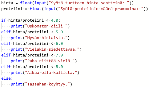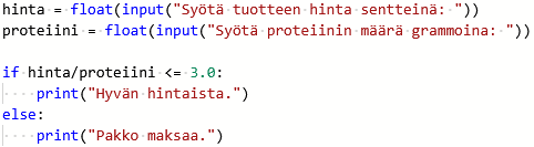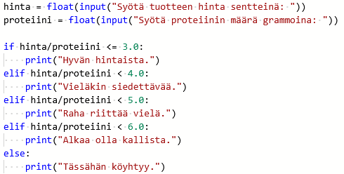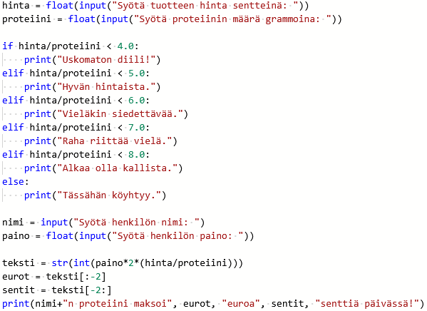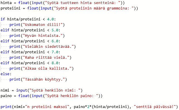 b) Aina ei päästä noinkaan alhaisiin lukemiin. Lisätään siis ehtoja hinnan tarkasteluun. Jos proteiinin hinnaksi saadaan alle neljä (4.0) senttiä grammaa kohden, voidaan tulostaa ”Vieläkin siedettävää.” Jos alle viisi (5.0) snt/g, tulostetaan ”Raha riittää vielä.” Jos alle kuusi (6.0) snt/g, tulostetaan ”Alkaa olla kallista.” Jos yli kuusi (6.0) snt/g, tulostetaan ”Tässähän köyhtyy.”