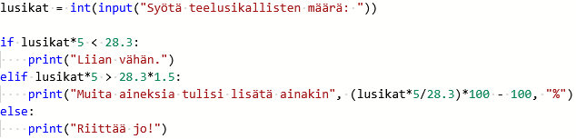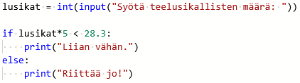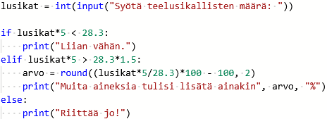 a) Keittokirjassa on ohje, johon tarvitaan yksi unssi (n. 28,3 g) kaakaojauhetta. Kirjoita ohjelma, joka ottaa syötteenä määrän teelusikallisia (n. 5 g) ja tulostaa ”Liian vähän.”, jos niiden yhteenlaskettu määrä ei ylitä yhtä unssia. Muussa tapauksessa tulostetaan ”Riittää jo!”