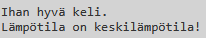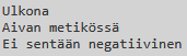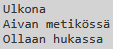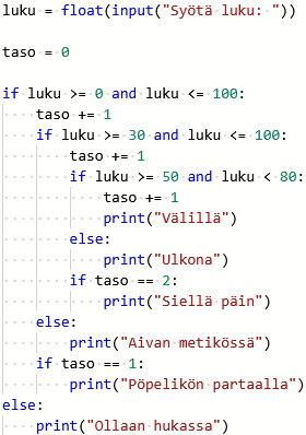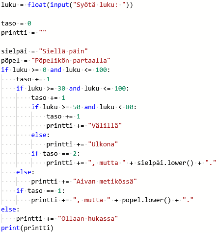 b) Lisätään ohjelmaan tulostus ”Siellä päin”, jos luku on välillä [30:100]. Jos luku ei kuitenkaan ole tälläkään välillä, tulostetaan ”Aivan metikössä”.