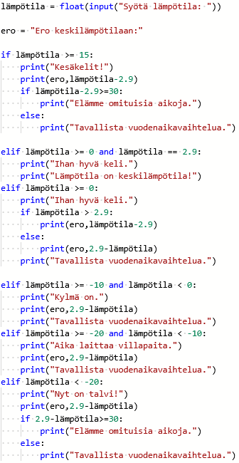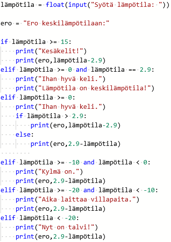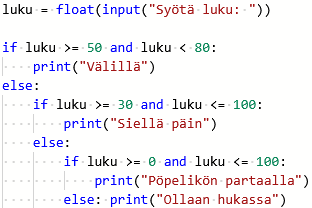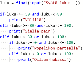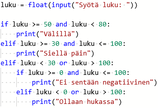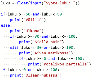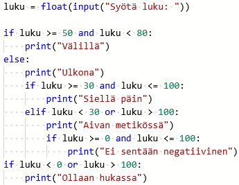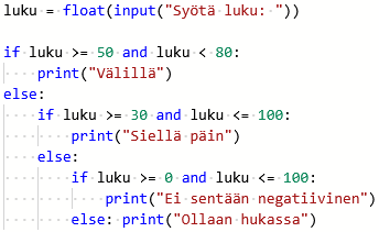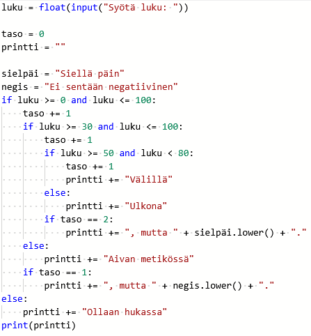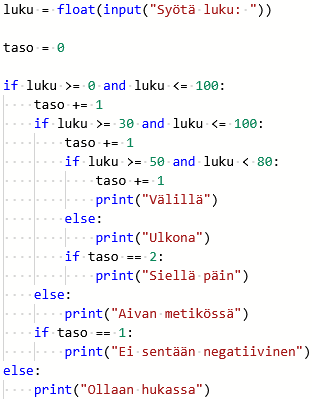 c) Useimmiten b-kohdan kaltaiset sisäkkäiset ehtorakenteet eivät ole suositeltavia, sillä koodista tulee sotkuisen näköistä ja on vaikea pysyä kärryillä, missä koodilohkossa oikeasti ollaan, jos kyseessä on monimutkaisempi ehtorakenne. Pythonin syntaksissa sisennys on oleellinen osa, mikä toisaalta pakottaa pitämään koodin suhteellisen siistinä siinä suhteessa (useissa ohjelmointikielissä sisennykset eivät ole pakollisia). Kuitenkin sisennyskin voi tehdä koodista vaikeaselkoisempaa. Jos sisennyksiä on käytetty paljon, saattaa koodia ymmärtääkseen tarvita viivoitinta.