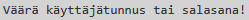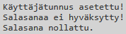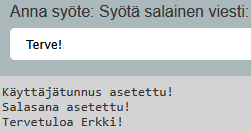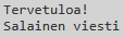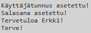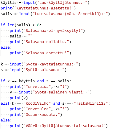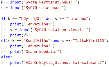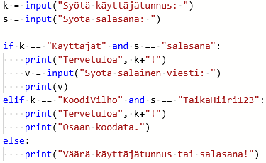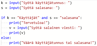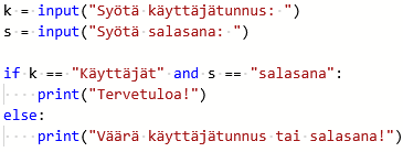 a) Kirjoita ohjelma, joka kysyy käyttäjätunnusta ja salasanaa. Syötettäessä oikeat kirjautumistunnukset ohjelma tulostaa ”Tervetuloa!” Jos kirjautumistiedot ovat virheelliset, ohjelma tulostaa ”Väärä käyttäjätunnus tai salasana!”