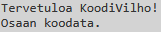 Tämä on yksi ratkaisu, jossa hyödynnetään muuttujia ja merkkijonometodeita. Vaihtoehtoisia ratkaisuja on monia ja jos tulostus on oikeellinen, ei sisällöllä välttämättä ole väliä.
