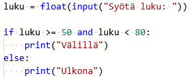 a) Matematiikassa luvut voivat olla suljetuilla tai avoimilla väleillä. Kirjoita ohjelma, joka ottaa syötteenä liukuluvun ja tulostaa ”Välillä”, jos se on välillä [50:80[ ja ”Ulkona”, jos se on välin ulkopuolella.