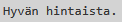 a) Kehonrakentajat rakastavat proteiinia. Se kuitenkin maksaa suhteellisen paljon. Tee ohjelma, joka kysyy syötteenä tuotteen hinnan ja proteiinin määrän grammoina. Jos hinta on kolme (3.0) tai vähemmän senttiä grammalta, voidaan todeta proteiinin hinnan olevan siedettävällä tasolla ja tulostaa ”Hyvän hintaista.” Muutoin tulostetaan ”Pakko maksaa.”