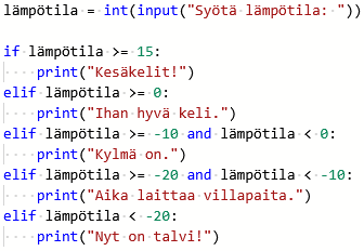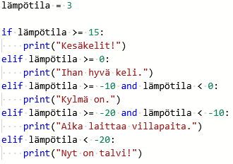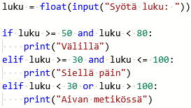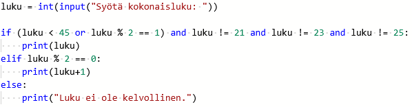 d) Tässä vaiheessa emme kuitenkaan turvaudu exit():in kaltaisiin lauseisiin, sillä ne eivät sisälly oppimäärään. Vaihtoehtona ehtojen peräkkäin laittamiselle voimme kaunistaa koodia sulkeiden avulla. Vaikka Pythonissa sisennys ja rivitys kuuluu olennaisesti syntaksiin, voimme muun muassa sulkeiden avulla kiertää tämän ja rivittää sulkeiden sisällä olevan koodin siten kuin haluamme.