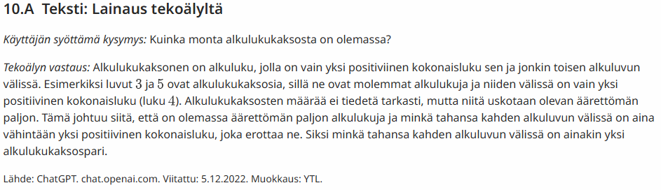 Alkulukua q kutsutaan alkulukukaksoseksi, jos myös q +2 tai q -2 on alkuluku. Tekoälyltä kysyttiin, kuinka monta alkulukukaksosta on olemassa, ja sen vastaus on tekstissä 10.A. Vastaa aineiston pohjalta seuraaviin osatehtäviin.