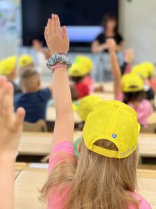 Opettajat noutavat torstaiaamuna oppilaat koulun pihalta. Sen jälkeen on salissa lyhyt ekaluokkalaisten tervetuliaisseremonia.