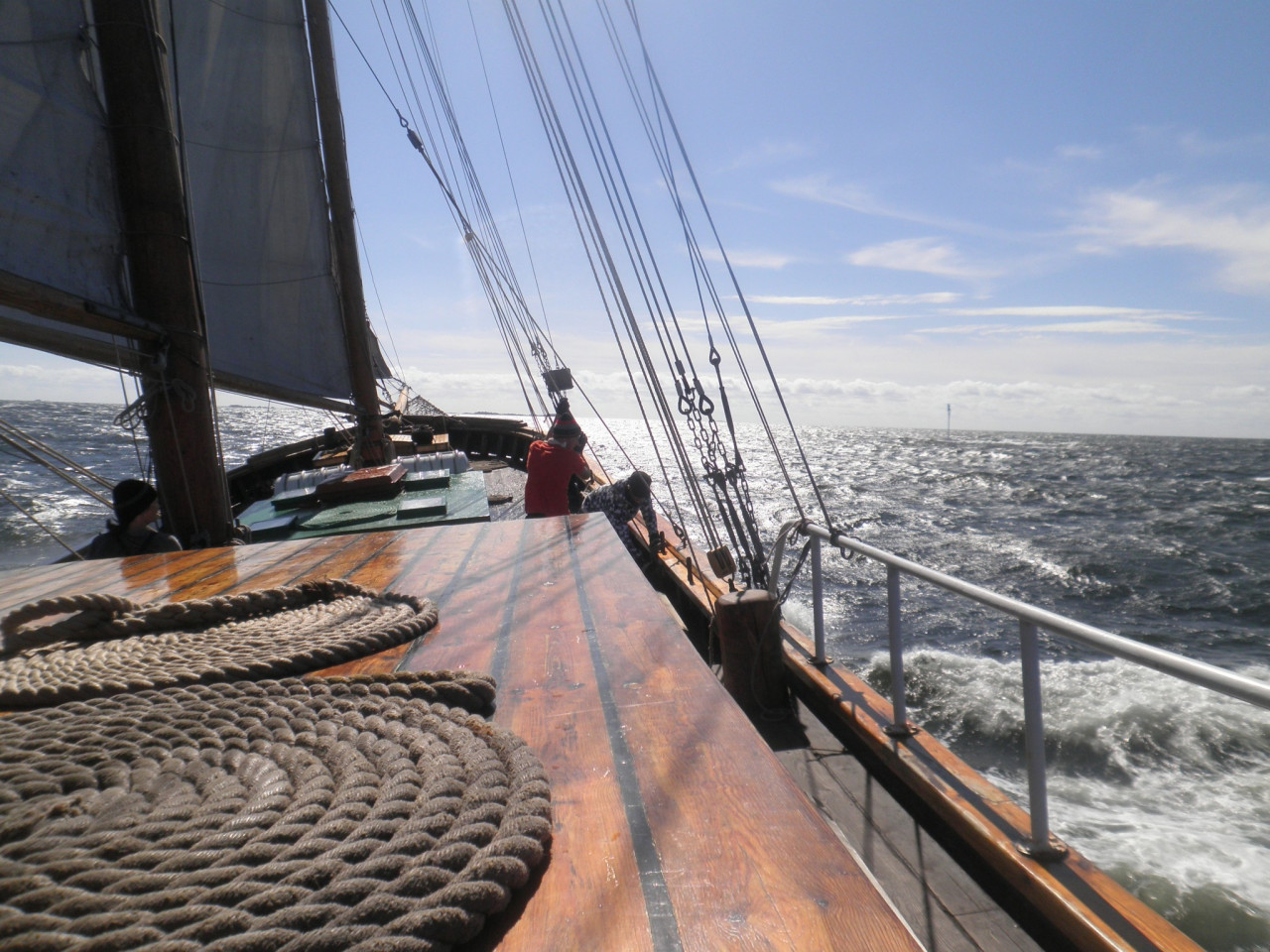 Tuulen nopeus oli lähtiessä 10 m/s. Purjehdimme sivutuulessa ja pyrimme ajamaan lähes vastatuuleen. Ja sitten kryssittiin.. Aurinko paistaa ja valkoiset vaahtopäät valtaavat maisemat, vuonna 1862 rakennetun historiallisen majakan siintäessä taustalla horisontissa. Vauhtimme hiipui lähes 9 solmun nopeudesta n. 4 solmuun aaltojen kasvaessa ja vastatuulen yltyessä. Aallon korkeus oli reilusti toista metriä eli mainingit olivat melkoiset (Söderskärissä n. 3 m). Tuuli yltyi parhaimmillaan puuskissa jopa 15 m/s! Aallokko alkoi tuntua ruorin takana melkoiselta kun aallot löivät kansimiesten yli kastaen heidät läpimäriksi. Alapuoleltamme kuului kolinaa jonka jälkeen saimme viestin byssasta, jossa tavarat olivat tippuneet hyllyiltä. Arvioimme tilanteen ja päädyimme tekemään vastakäännöksen ja palata purjehtimaan rauhallisemmille vesille. Kapteenin johdolla lähdimme valmistautumaan kurssin muuttamiseen. Alusta käännettäessä tapahtui jotain odottamatonta: isopurjeen kahvelipuomi napsahti poikki!
