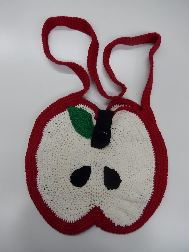 Ylhäällä Eliaksen tekemä laukku, Fridan itse muotoilema marsu ja Ainon upea kaksipuoleinen virkattu olkalaukku.