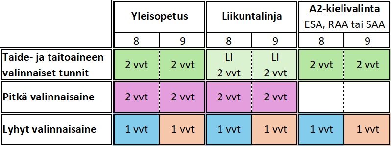 Taito- ja taideaineiden valinnaisia tunteja opiskellaan yhdestä aineesta kaksi vuosiviikkotuntia sekä kahdeksannella että yhdeksännellä luokalla. Myös niin kutsuttua pitkää valinnnaisainetta opiskellaan kaksi vuosiviikkotuntia sekä kahdeksannella että yhdeksännellä luokalla. Pitkien valinnaisaineiden joukosta valitaan niin ikään yksi. Pitkästä valinnaisaineesta tulee arvosana todistukseen.