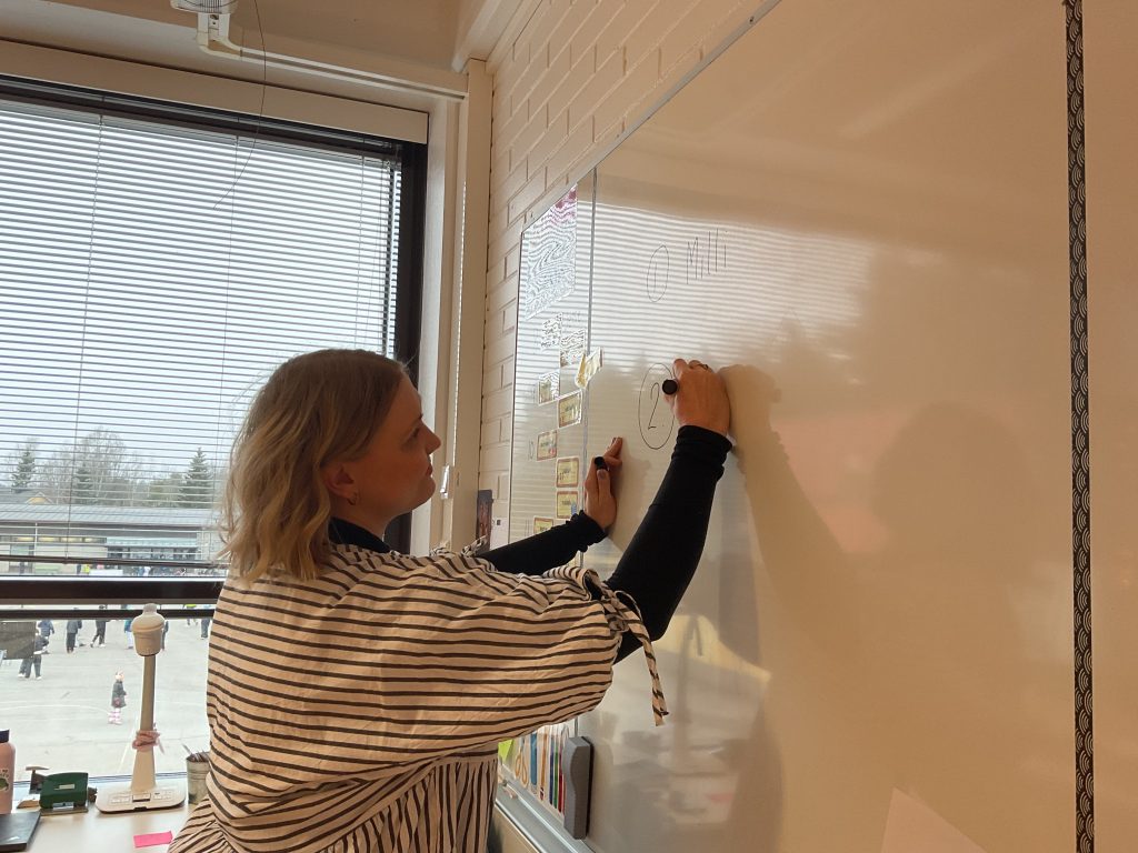 Anni kirjoittamassa tuntistruktuuria taululle.